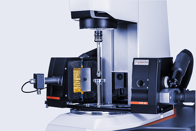Verwenden Sie die Feuchteoption, um die Temperatur und relative Feuchtigkeit während der Materialcharakterisierung mit Ihrem MCR-Rheometer zu kontrollieren. In Kombination mit dem Konvektionsofen CTD 180 Humidity Ready können Sie alle Anwendungen abdecken, bei denen Temperatur und relative Feuchtigkeit die rheologischen und dynamisch-mechanischen Eigenschaften des betreffenden Materials beeinflussen. Dieser Aufbau kann mit einer breiten Palette verschiedener Messsysteme und sogar in Konfigurationen mit zwei EC-Antrieben oder einem unteren Linearantrieb verwendet werden.