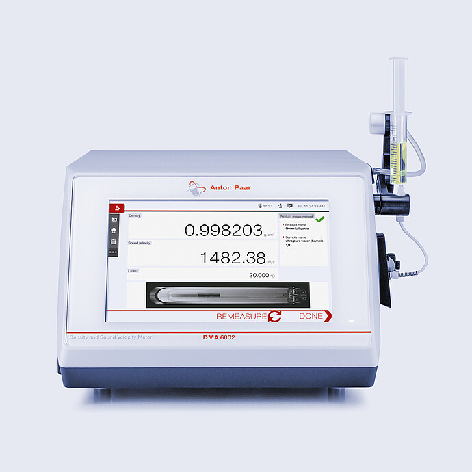 El DMA 6002 Sound Velocity es el único instrumento que combina a la perfección la medición de la densidad y la velocidad del sonido en una única configuración, ofreciendo resultados rápidos y muy precisos para la determinación de la concentración de soluciones de dos y tres componentes.