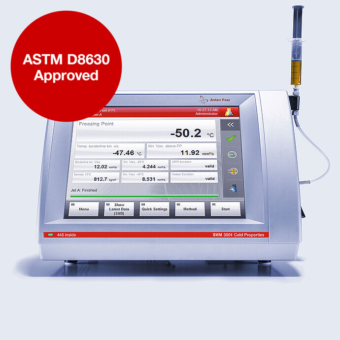 | Vizsgálati módszerek | ASTM D7042, D445 bias-corrected, ISO 23581, ASTM D4052 (opcionális) | ASTM D7042, D445 torzítás-korrigált, ISO 23581, ASTM D4052, ISO 12185 | ASTM D7042, D445 torzításkorrigált, ISO 23581, ASTM D4052, ISO 12185 AASTM D8630, ASTM D2500-zal egyenértékű vagy jobb | ASTM D7042, D445 torzítás-korrigált, ISO 23581, ASTM D4052, ISO 12185 |