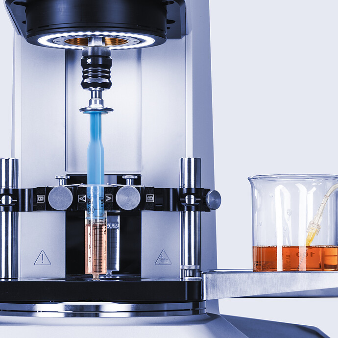The syringe test holder is used to squeeze water out of the syringe, while the force required to move the piston is recorded according to the ISO 7886-1 standard. The set-up consists of the height-adjustable syringe clamp, as well as a stand for a fluid reservoir to collect the squeezed-out sample. The DIN ISO 7886-1 standard is also referenced in USP<382> and USP<1382>.