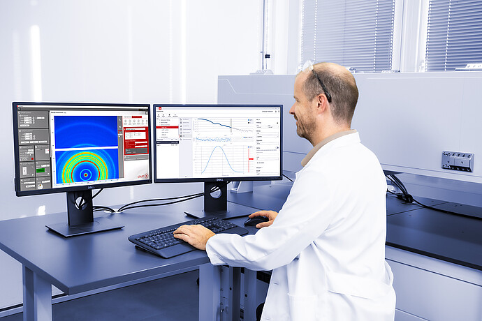 Para simplificar la evaluación de los datos, el software SAXS convierte automáticamente las mediciones a unidades absolutas sin necesidad de medir una muestra de referencia adicional. Esto no solo reduce el tiempo de medición, sino que también permite a SAXSanalysis Pro automatizar los flujos de trabajo posteriores sin intervención manual adicional.
